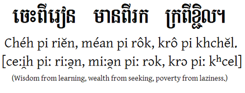 | Khmer-Sprichwort Auch wenn niemand danach frug, hier mal ein Sprichwort auf Khmer. Oben in der Originalschrift, darunter in der Umschrift. In der 3. Zeile steht die genaue Aussprache in IPA (mehr oder weniger: "Tschejh pie rjen, mjen pie rock, kro' pie ktschel") und zu guter letzt die |