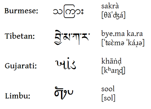 | Zucker auf Birmanisch, Tibetisch, Gujarati und Limbu Someone (though not from this forum; it was Wikipedia user Szoltys) wanted to know "sugar" in these 4 languages, so I uploaded it. On the right side the upper line is the transliteration, while the pronunciation is written in IPA in the line below. All these alphabets are written from left to right. Actually I was asked to include Oriya as well, but I had problems with the letters: the ones in the font don't always appear to be the same as in my dictionary. |