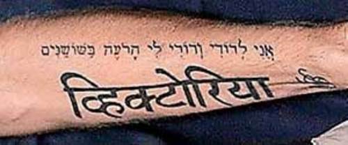 | Des David Beckhams Tattoos Der gute Herr Beckham hat auf seinem linken Arm ein Doppeltattoo, auf Hebräisch (oben, klein) und Hindi (unten, groß). Leider ist keins davon richtig. Das Hindi-Wort soll den Namen seiner Frau darstellen, die Victoria heißt. Allerdings steht da "Vhikṭoriyč", also vorne mit "vh", warum nur? So ganz nach dem Motto "Bend it like Beckham"?