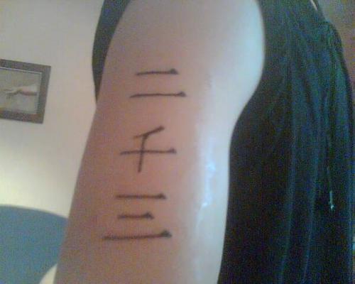 | Unsinniges Tattoo Hier mal ein Beispiel, warum man sich nix auftättowieren lassen soll, was man nicht lesen kann. Das hier ist nur ein Foto eines Fotos, das als Werbung(!!!) an einem Tattoo-Studio in Leipzig hing.