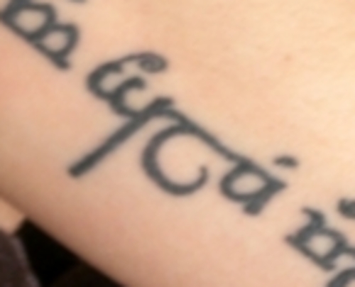 |  | "Gurke" auf Pali Nein, nicht wirklich Gurke... aber geworden ist's trotzdem eine. Hier wollte eine wohl das Tattoo von Angelina Jolie nachmachen und hat als Vorlage vermutlich nur einen ganz verschwommenen Zeitungsausschnitt gefunden und diesen dann vergrößert. Lesen kann man da natürlich nichts mehr, ist praktisch Kriekselkraksel ohne Bedeutung. Schade drum, dabei war Angelinas Pali-Tattoo bei näherer Betrachtung ja recht fein gearbeitet. Das hier ist stümperarbeit und gehört gecovert. Und das Ding rechts gleich mit, was auch immer das sein soll (ich fürchte, auch dort soll man Buchstaben erkennen)... Fehlanzeige. |