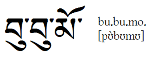| "Pamo" (Heldin) auf Tibetisch Hier noch ein(e Aus)Na(h)me auf Tibetisch: Der Name "Pamo", der 'Heldin' bedeutet. Neben dem Schriftbild die Wylie-Transliteration und drunter die Aussprache im Lhasa-Dialekt, in etwa wie: "Pammu" (in hohem Ton). |