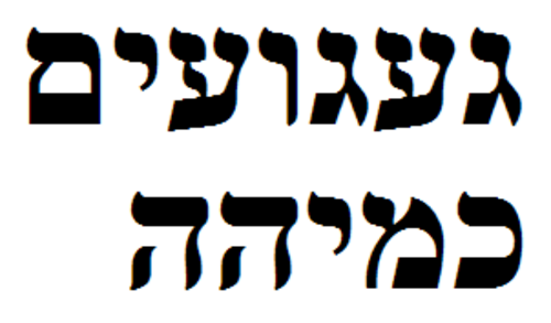 Hebräisch & Jiddisch| Hier befinden sich einige Namen und Wörter in der hebräischen und eventuell auch mal jiddischen Sprache. Die beiden Sprachen werden mit der selben Schrift geschrieben, deshalb. Man schreibt sie von rechts nach links und die Vokale werden meistens nicht gekennzeichnet. Die Schriftart, die ich benutze, ist wenn, dann meist einfaches Times New Roman. Viel mehr Schriften habe ich nicht für Hebräisch. |  | "Luna" auf Hebr Der Name Luna (also nicht der Name des Mondes) auf Hebr |