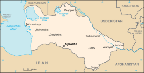 Turkmenistan grenzt (im Uhrzeigersinn) an Kasachstan, Usbekistan, Afghanistan, den Iran und das Kaspische Meer.