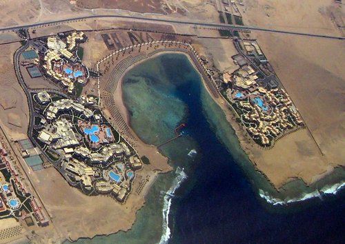 Dieses Bild habe ich aus dem Flugzeug beim Anflug auf den Flughafen gemacht. Der Flughafen Marsa Alam liegt zum Glück nur 10 Minuten von dieser Bucht entfernt. (Wer nur nach Hurgada fliegt darf sich auf 3 Stunden ägyptischen Fahrstils einstellen.)