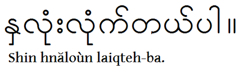 | "Folge deinem Herzen." auf Birmanisch Bei dem Satz bin ich mir wirklich nicht sicher... Meine Birmanisch-Grammatik gibt leider nicht viel her. Besonders unsicher bin ich mir bei dem "Shin" (= 'du' oder 'dein') am Satzanfang. Ich glaube nicht, dass das so richtig ist, w |
