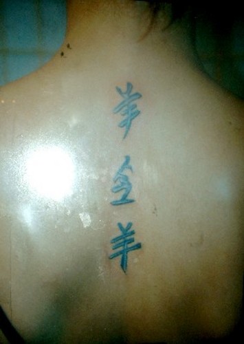 *) Dank www.hanzismatter.com hab ich jetzt rausgefunden, was das Tattoo ursprünglich bedeuten sollte: 羚羊 (língyáng), das heißt Antilope. Der Tättowierer war nur so blöd und hat das 1. Schriftzeichen für zwei gehalten. *ggg* |