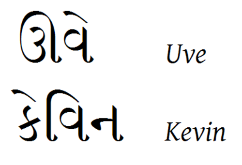 | "Uwe" und "Kevin" auf Gujarati Ja, bald bald erstell ich auch 'nen Gujarati-Ordner... also hier "Uwe" und "Kevin" in der entsprechenden Schrift. Daneben in Umschrift. Hab bei der ersten einen Fehler gemacht, das sollte eigentlich "?ve" hei |