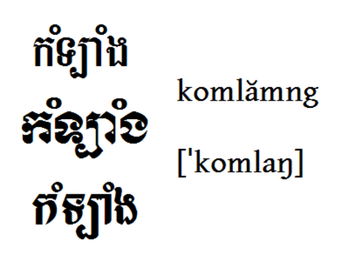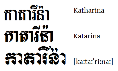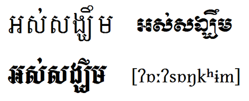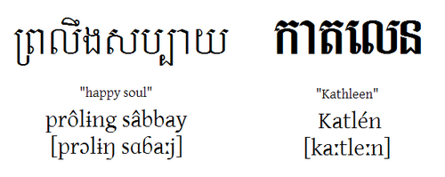 | Khmer-Sprichwort Auch wenn niemand danach frug, hier mal ein Sprichwort auf Khmer. Oben in der Originalschrift, darunter in der Umschrift. In der 3. Zeile steht die genaue Aussprache in IPA (mehr oder weniger: "Tschejh pie rjen, mjen pie rock, kro' pie ktschel") und zu guter letzt die |