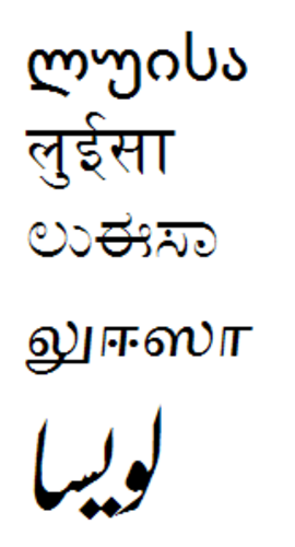 | "Luisa" auf Georgisch, Hindi, Kannada, Tamil und Arabisch Hier der Name "Luisa" auf Georgisch, Hindi, Kannada, Tamil und Arabisch (v.o.n.u.). Die genauen Transkriptionen sind jeweils: Luisa, Lu?s?, Lu?s?, Lu?s? und L?ys?.