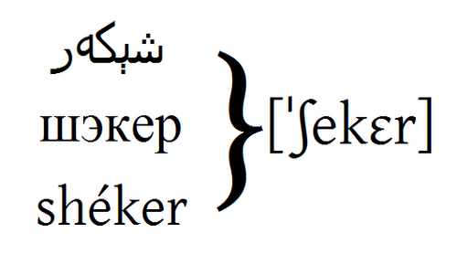 | "Zucker" auf Uigurisch Yet another word for sugar... this time in Uyghur. Uyghur used to be written with the Cyrillic script (middle), afterwards with the Latin alphabet (bottom), but currently the Arabic alphabet is in use (top). On the right side I wrote the pronunciation in IPA. |