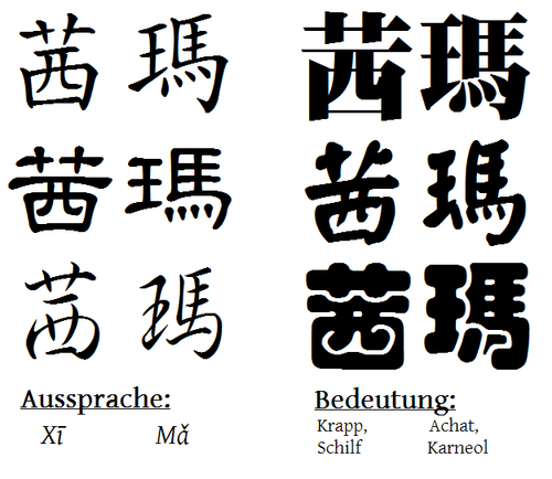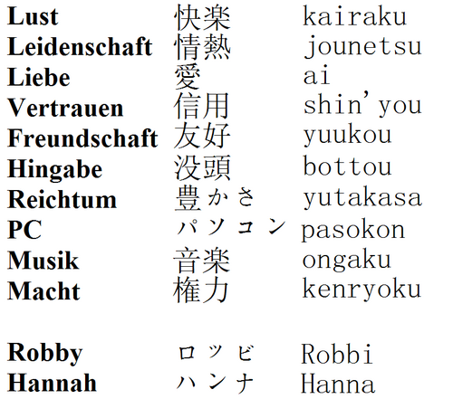 Da inzwischen auch explizit Anfragen wegen Japanisch kommen und man dort z.T. auch Kanji (d.h. chinesische Schriftzeichen) verwendet, habe ich mich entschlossen, Japanisch und Chinesisch kurzerhand zusammenzulegen. Außer Kanji benutzt man noch Hiragana für (u.a.) grammatische Endungen und Partikeln, sowie Katakana für die Schreibweise von ausländischen Namen, Tieren und Geräuschen. |  | Japanische Worte Einige japanische Worte, die jemand mal als Bilddatei haben mochte. Rechts steht die Aussprache. Das Bild ist zur freien Verf |
