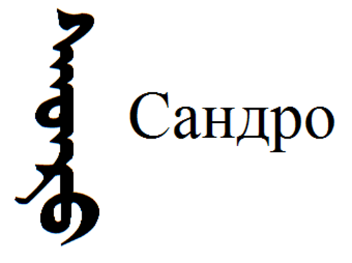| "Sandro" auf Mongolisch Hier der Name Sandro. Ich bin mir aber ehrlich gesagt nicht so sicher dabei... mein mongolisches Schreibprogramm ("Qagucin monggol bicig") hat's so ausgespuckt und ich hab's mal so abgeschrieben... irritieren tut mich das T/D in der Mitte |
