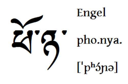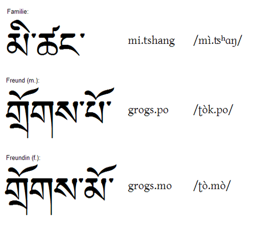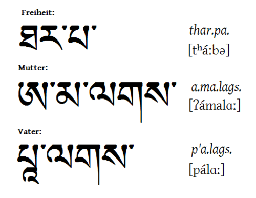 | "Freiheit", "Mutter" und "Vater" auf Tibetisch Alles wie gehabt, links die Schreibweise, rechts die Umschrift und in eckigen Klammern die Aussprache in IPA. |