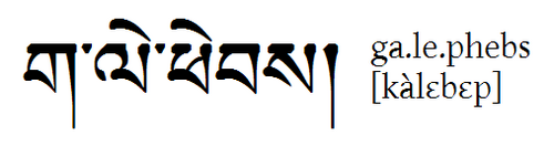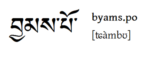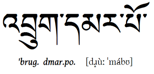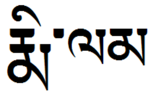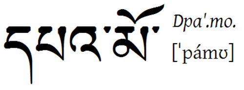 | "Pamo" (Heldin) auf Tibetisch Hier noch ein(e Aus)Na(h)me auf Tibetisch: Der Name "Pamo", der 'Heldin' bedeutet. Neben dem Schriftbild die Wylie-Transliteration und drunter die Aussprache im Lhasa-Dialekt, in etwa wie: "Pammu" (in hohem Ton). |