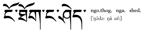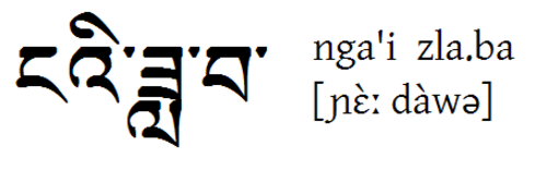 | "mein Mond" auf Tibetisch Das hier hei?t "mein Mond" auf Tibetisch. Das nga'i hei?t "mein" und das "zla.ba" bedeutet Mond. Die Aussprache weicht hier deutlich von der Schreibweise ab, so dass "nga'i zla.ba" eigentlich wie "nj?? daue" (genaue Aussprache steht in IPA in eckigen Klammern) ausgesprochen wird. Beide W?rter werden im tiefen Ton gesprochen. |