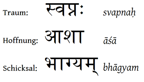 Hindi & Sanskrit| Hier befinden sich alle Bilder, die entweder auf Hindi oder Sanskrit sind. Wahlweise auch Nepali oder Marathi, aber danach hat bisher noch niemand gefragt. Diese Sprachen benutzen sämtliche das Devanagari-Alphabet, sehen sich also recht ähnlich. Die Schrift wird von links nach rechts geschrieben. Meistens habe ich wohl die Aussprache in den Bildern oder den Beschreibungen mit angegeben... |  | "Traum", "Hoffnung" und "Schicksal" auf Sanskrit Hier noch mehr typische Tattoow |