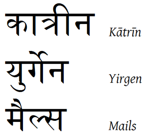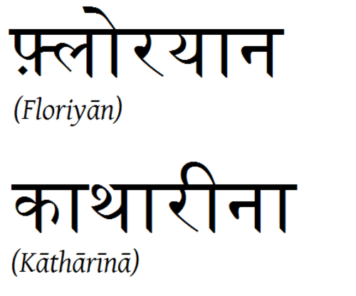 | "Florian" und "Katharina" auf Hindi Ja, hier die beiden Namen auf Hindi, mit Aussprache bzw. Umschrift drunter. |