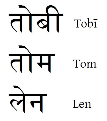 | "Tobi", "Tom" und "Len" auf Hindi Wie gesagt, diese 3 Namen auf Hindi. Mehr zu sagen ist da eigentlich nicht. Alle Angaben sind wie immer ohne Gew |