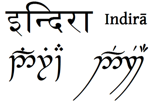 | Indira auf Hindi/Sanskrit und Elbisch Dies ist der indische Name Indira. Links oben auf Sanskrit/Hindi (also in Devanagari-Schrift), rechts oben in lateinischen Buchstaben, unten jeweils zweimal auf Elbisch (Sindarin-Modus): links normal, rechts kursiv. Alles wird von links nach rechts geschrieben. Theoretisch k |
