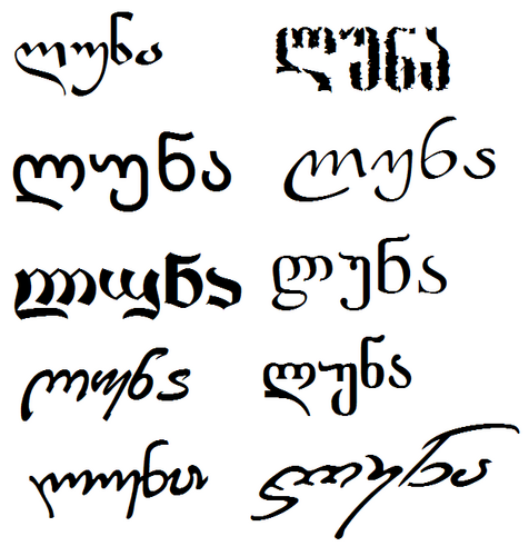 Georgisch| Georgisch spricht man in Georgien, wer hätte das gedacht? Es ist eine südkaukasische Sprache, die ansonsten nur mit Svanisch, Mingrelisch und Lasisch verwandt ist (die man auch alle in Georgien und in dem an Georgien angrenzenden Teil der Türkei spricht). Sonst besteht keine Verwandtschaft zu irgendeiner anderen Sprache. Ich hab 'ne ziemliche Menge an schönen georgischen Schriftarten, die man in einigen der Bildern auch sehen kann. Anklicken zum Vergrößern! |  | "Familie" auf Georgisch Die Frage war, was Familie auf Georgisch hei |