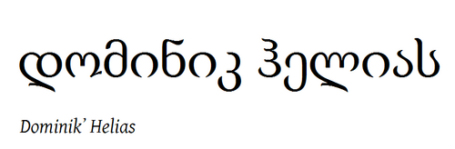 | "Dominic Helias" auf Georgisch Das ist der Name "Dominic Helias". Meiner Meinung ein ganz furchtbarer Name, aber ist ja nicht mein Kind. ;) Viel zu sagen gibt's zu der Umschrift nicht. Die Transkription in lateinischen Buchstaben steht drunter. Wenn noch jemand Dominik oder Dominic suchen sollte, dann kann er einfach das linke nehmen und den Rest weglassen. |