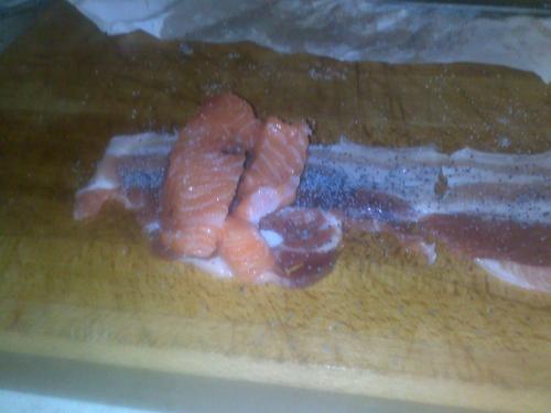 Avvolgere la mezza fetta di salmone con una fetta di pancetta (come un involtino).