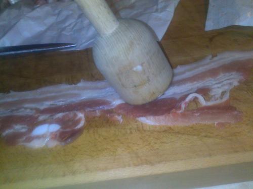 Battere la pancetta con il batticarne.